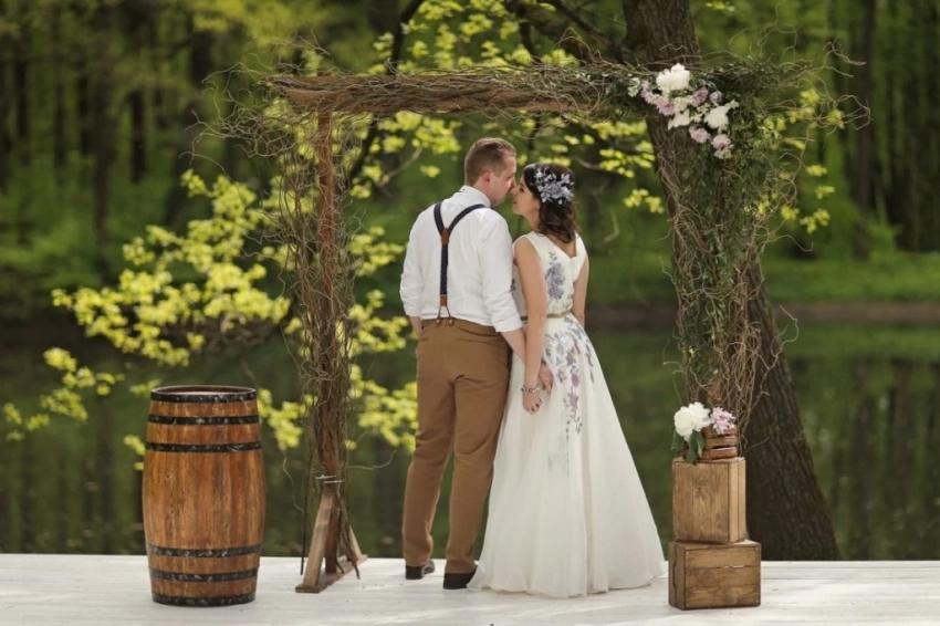Деревенские обряды, наверное, одни из самых красивых и оригинальных. Все они проходят в живописных местах на лоне природы (зеленый парк, поляна в лесу, высокое дерево в поле, берег реки или озера, приусадебный участок) или практически на открытом воздухе, например, в палатке, ангаре или под крышей. Популярным элементом декора является СВАДЕБНЫЙ Бант, который изготавливается из различных материалов: веток, тканей и лент. Арку можно украсить живыми цветами, растениями и местами для хранения.